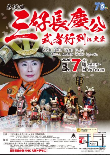 「第10回記念 三好長慶公武者行列in大東」が北条公園にて開催されます。 三好長慶公役の大東市長を先頭に武者行列が大東市内を練り歩きます!