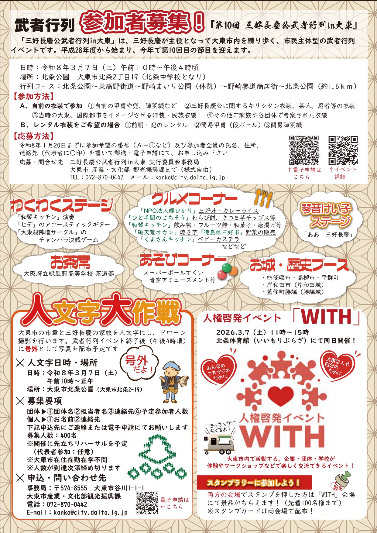 「第10回記念 三好長慶公武者行列in大東」が北条公園にて開催されます。 三好長慶公役の大東市長を先頭に武者行列が大東市内を練り歩きます!